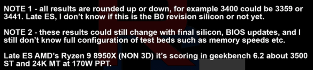 RGT(RedGamingTech)가 Ryzen 9 8950X에 대해 제공하는 수치를 비교하면 단일 스레드 Geekbench 6에서 12%~21% 증가한 반면, 멀티 스레드 벤치마크 이득은 18%~40%로 더 큽니다. 여기서 차이는 Geekbench 데이터베이스에서 사용 가능한 벤치마크 결과의 범위로 귀결됩니다. 공식 Geekbench CPU 차트의 수치를 사용하면 싱글 스레드가 16%이고 멀티 스레드가 25%입니다.