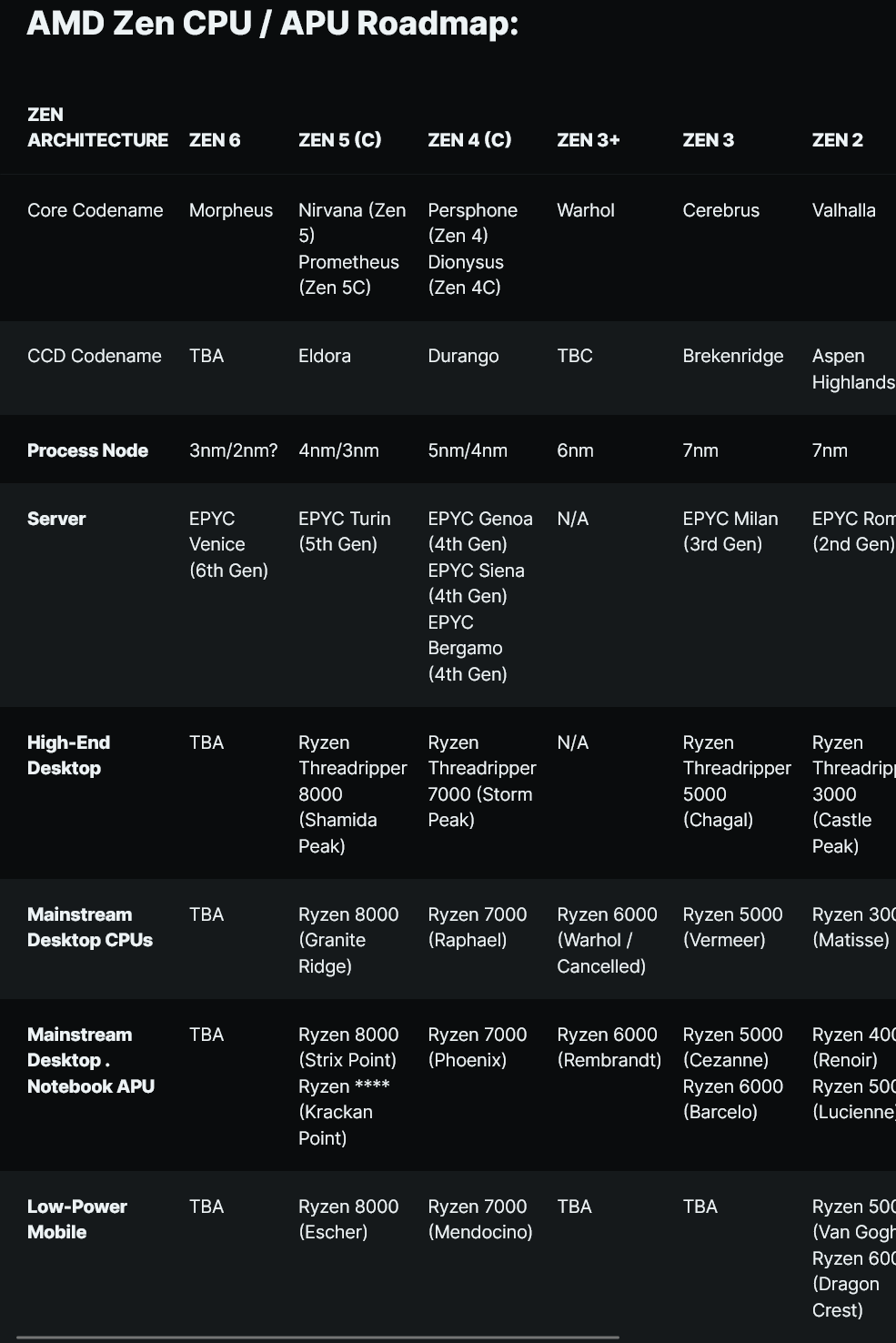 게다가 유출에는 새로운 코드명인 프로메테우스(Prometheus)도 언급되어 있습니다. 이전 유출 에서는 Zen 4 코드명이 Persephone, Zen 5는 Nirvana, Zen 6은 Morpheus인 것으로 밝혀졌습니다 . Zen 4C 코어의 코드명은 Dionysus인 것으로 알려져 있으므로 Prometheus가 Zen 5C 코어의 코드명일 가능성이 높습니다.