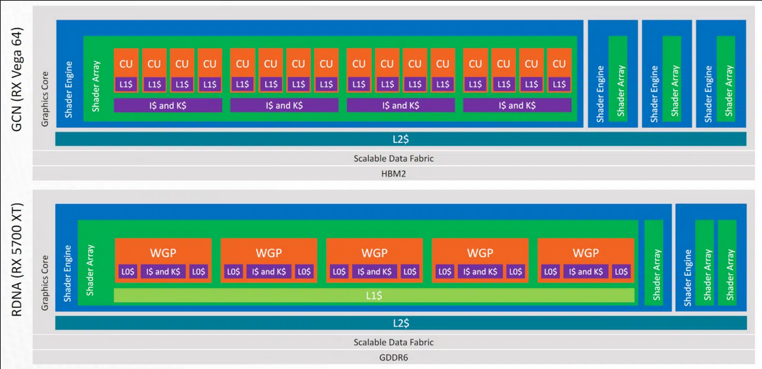 RDNA의 주요 변경 사항은 RB 가 그래픽 L1 캐시를 통해 데이터에 액세스하여 L2 캐시에 대한 압력을 줄이고 더 적은 수의 데이터를 이동하여 전력을 절약한다는 것입니다. GCN에서는 RB가 메모리에 직접 데이터를 썼고 , Vega에서는 L2 캐시를 통해 데이터를 썼습니다.