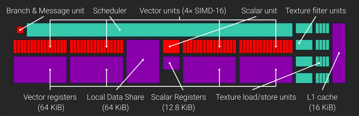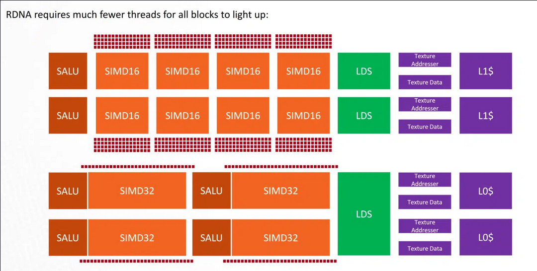 RDNA의 가장 주목할만한 변화 중 하나는 매 사이클마다 32개 항목 파면을 실행할 수 있는 더 넓은 SIMD 장치를 도입한 것입니다. 컴퓨팅 유닛당 셰이더 수는 여전히 64개이지만 32개 폭의 SIMD32 유닛에 분산되어 있습니다. 또한 각 CU는 다른 CU와 쌍을 이루어 스칼라 및 명령 캐시 등을 서로 공유합니다 .