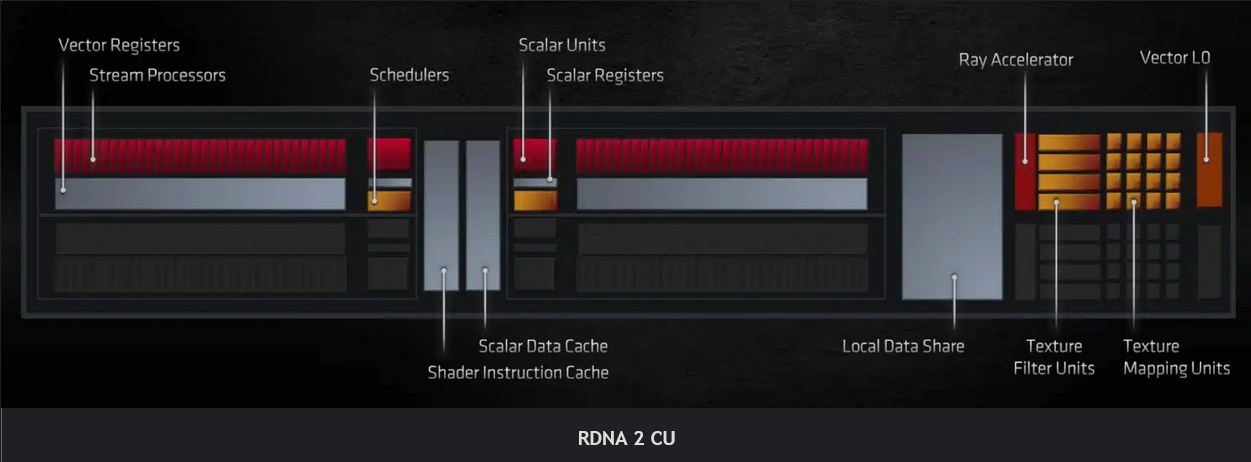 RDNA 1의 컴퓨팅 유닛은 사이클당 4개의 명령, 2개의 스칼라 및 2개의 벡터를 전달할 수 있습니다. 결과적으로 RDNA1 WGP는 클록당 128개의 벡터 와 4개의 스칼라의 처리량을 갖습니다 . 또한 각 SIMD는 10KB 스칼라 레지스터 덕분에 비행 중에 최대 20개의 파면을 유지할 수 있습니다.
