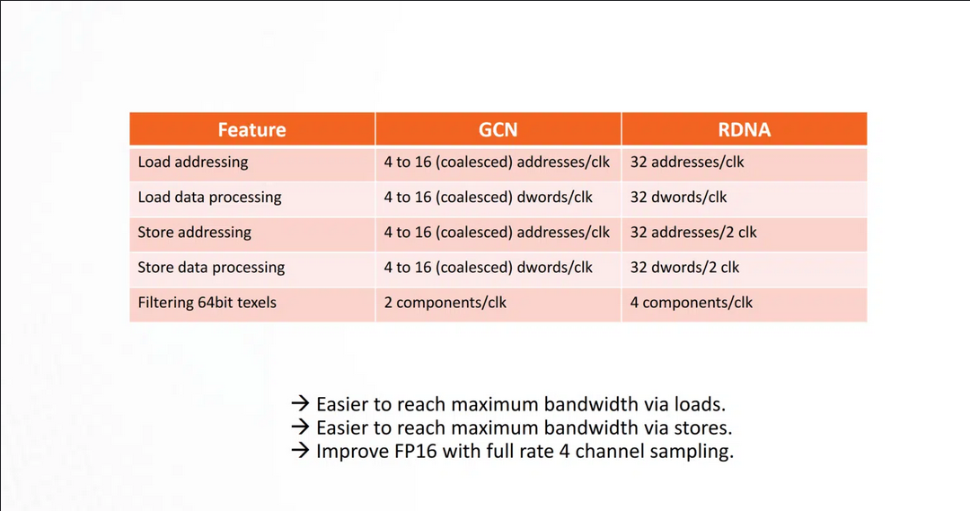 Navi의 Texture Unit은 Vega보다 훨씬 빠릅니다 . 로드 및 저장 처리 속도는 GCN에 비해 여러 배 빠르므로 GPU가 로드 및 저장을 통해 최대 대역폭에 더 쉽게 도달할 수 있습니다.