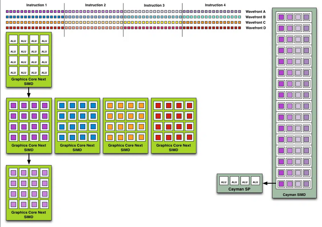 AMD의 각 GCN 컴퓨팅 유닛은 각각 16개의 SP를 포함하는 4개의 SIMD 유닛으로 나누어진 64개의 셰이더(스트림 프로세서)로 구성되었습니다. SIMD 장치는 작업 대기열의 16개 항목에 대해 단일 작업을 동시에 실행합니다(벡터 실행). 4개의 SIMD 장치는 16개의 대기열 작업 항목으로 구성된 4세트를 포함하는 별도의 파면에서도 작동할 수 있습니다.