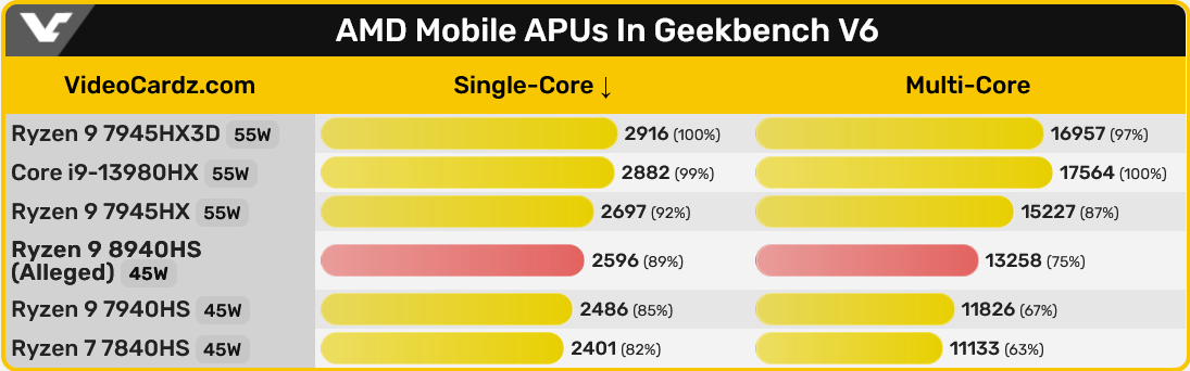 Geekbench가 수집하고 NotebookCheck가 독립적으로 테스트한 공식 데이터에 따르면 Ryzen 9 8940HS는 7940HS와 7945HX CPU 사이에 위치할 것이라고 합니다. 후자는 코어와 스레드가 두 배 더 많습니다.