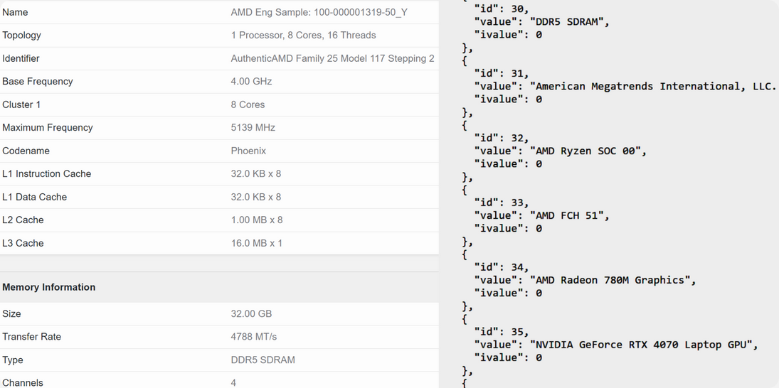 100-000001319-50으로 식별된 엔지니어링 샘플은 8개 코어와 5.1GHz를 초과하는 부스트 클럭(5.2GHz에 도달할 가능성이 있음)을 갖춘 피닉스 기반 CPU로 감지됩니다. 특히 베이스 클럭은 4.0GHz로 Ryzen 9 7940HS와 일치합니다. 피닉스 기반이라는 것은 Zen4 CPU 및 RDNA3 GPU 아키텍처를 갖추고 있음을 의미합니다.
