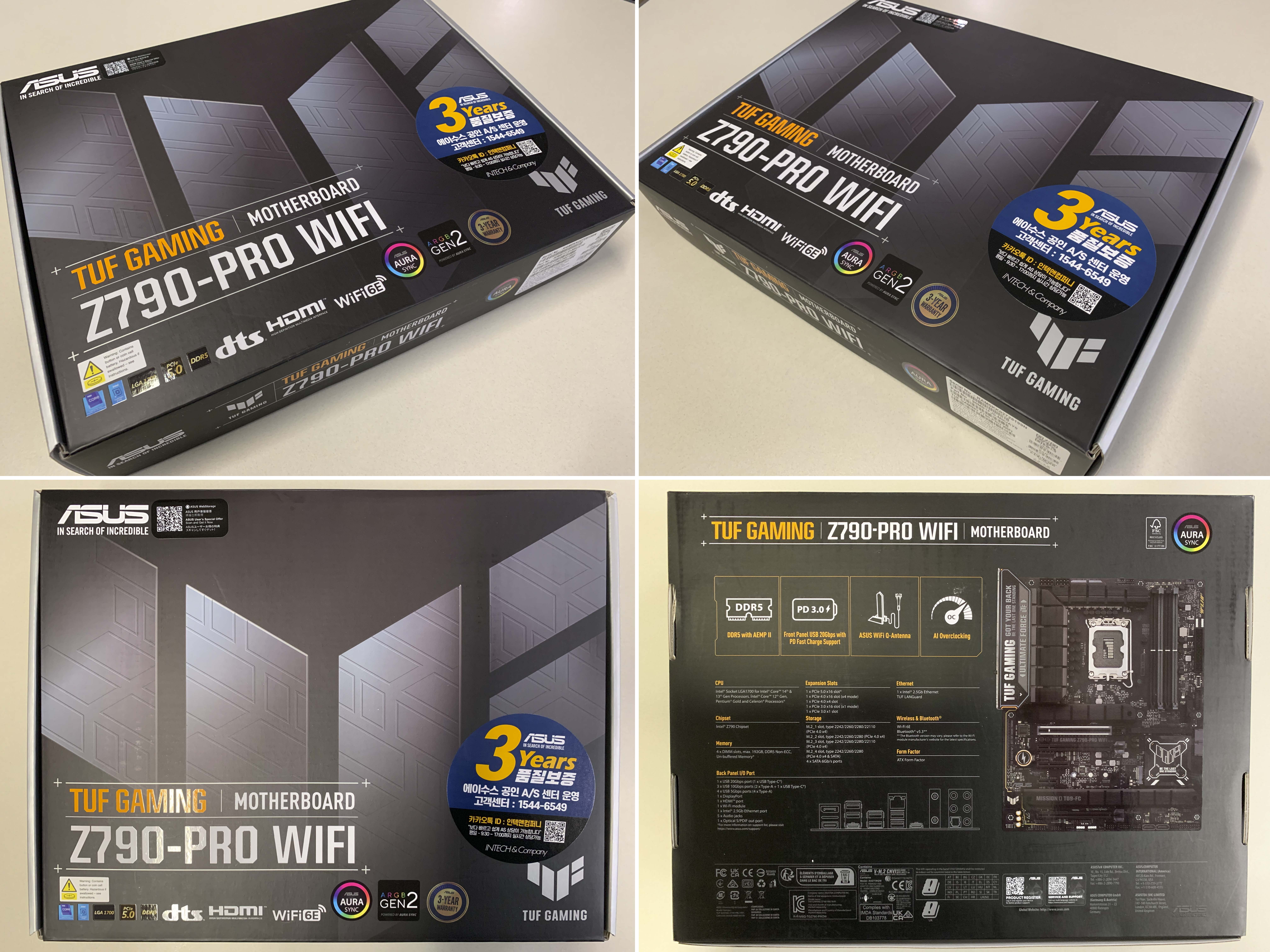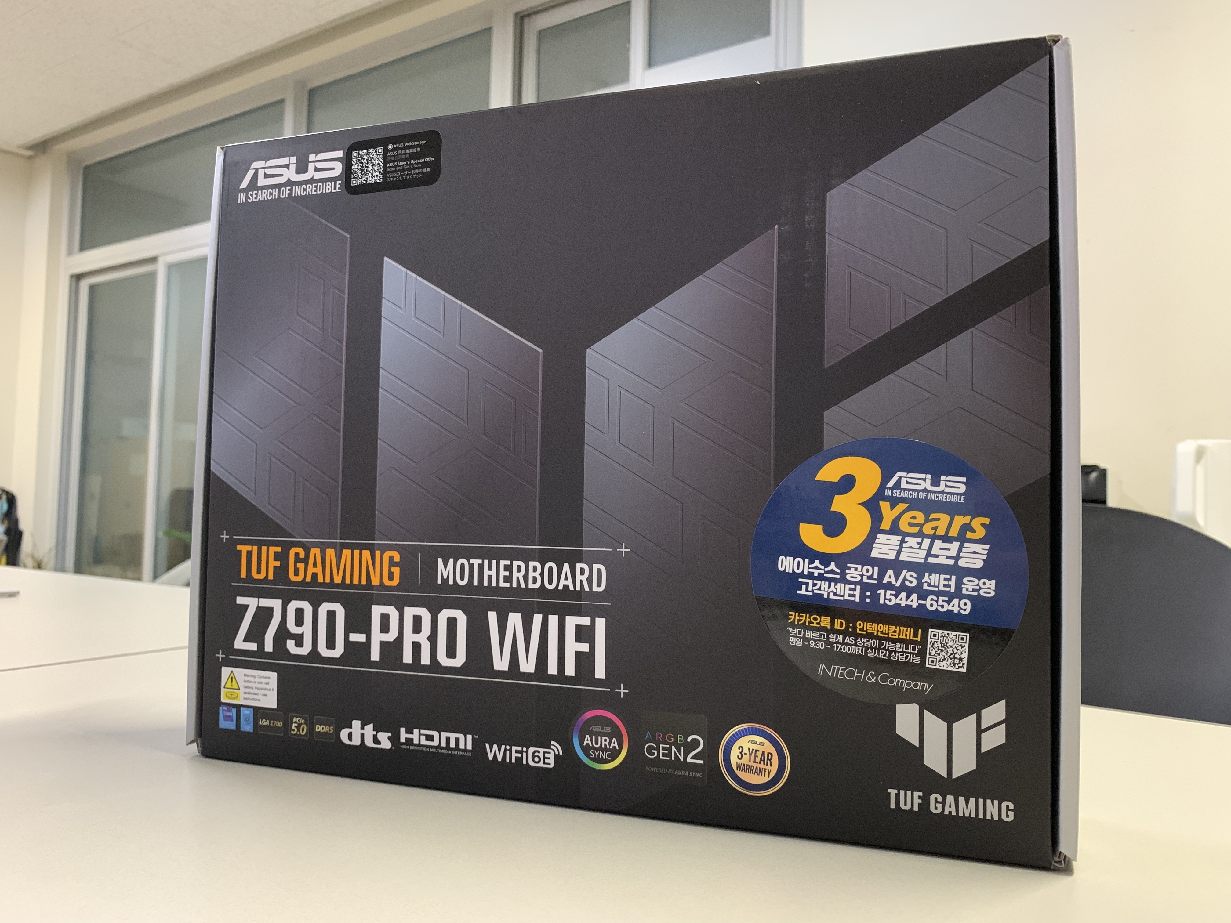 박스 앞면에는 3년 AS 보증 스티커가 붙어 있고, 뒷면에는 ASUS TUF Gaming Z790-PRO WIFI의 특징을 알 수 있습니다.