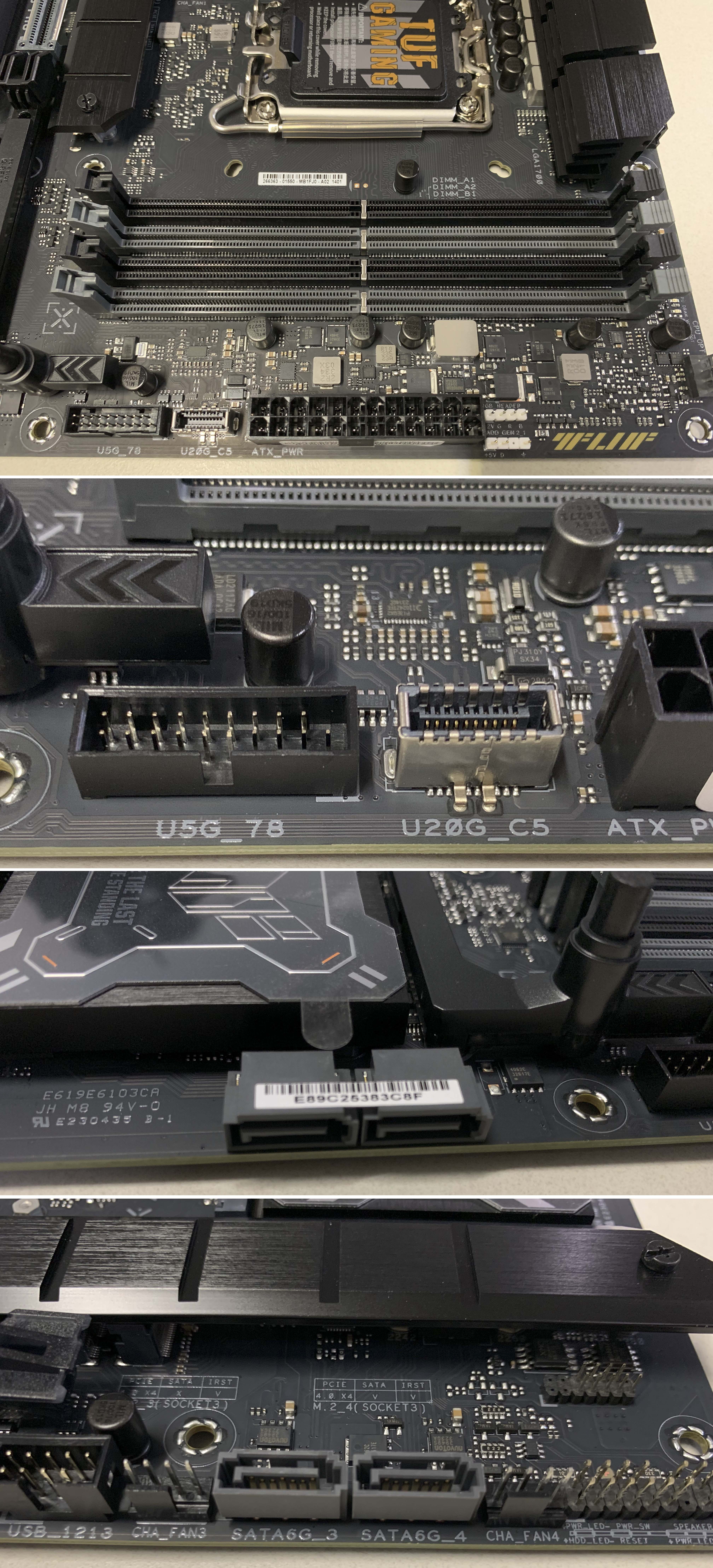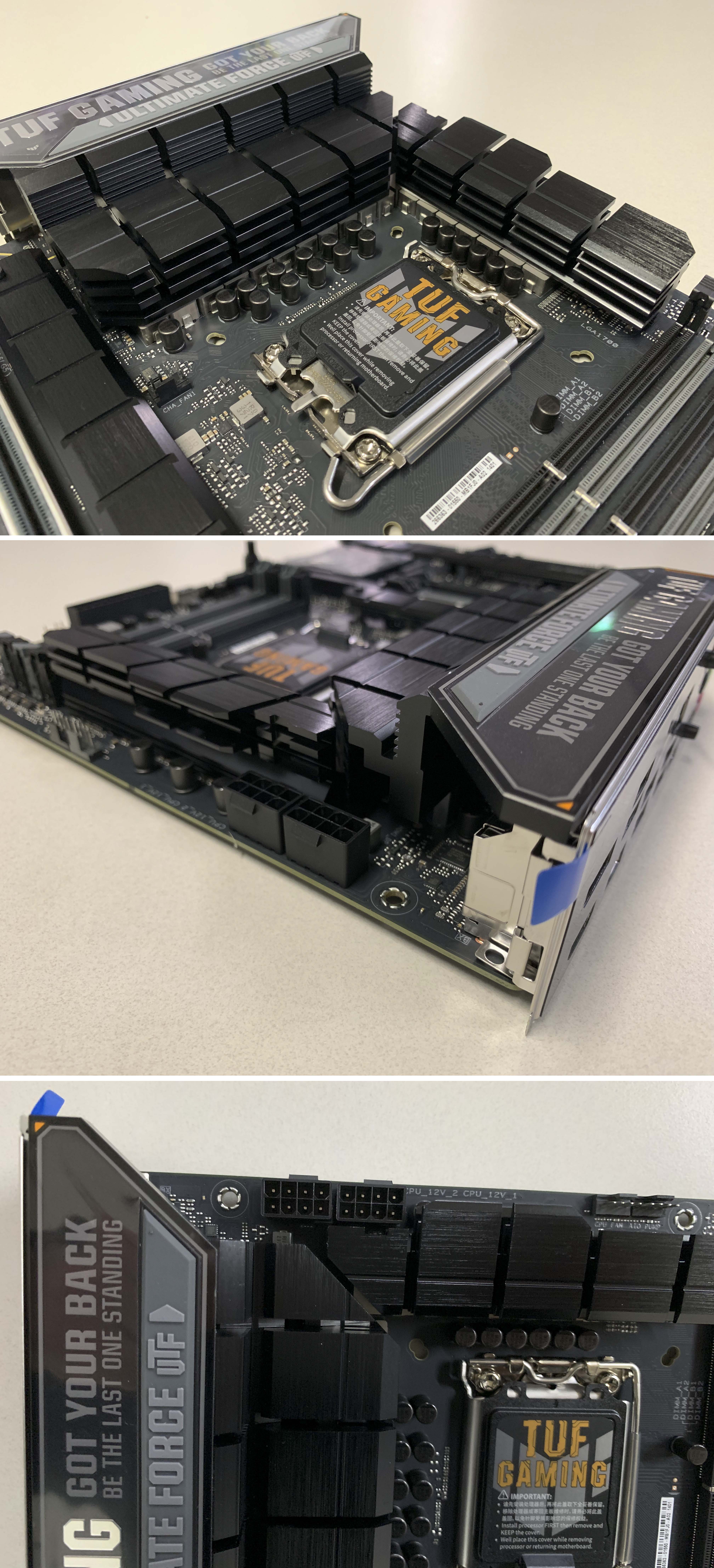 메인보드 거의 전체를 덮은 듬직한 히트싱크가 보기만 해도 시원한 쿨링이 기대됩니다. TUF GAMING 로고와 더불어 일관되고 통일성 잇는 디자인이 이름 만큼이나 튼튼하고 멋집니다.