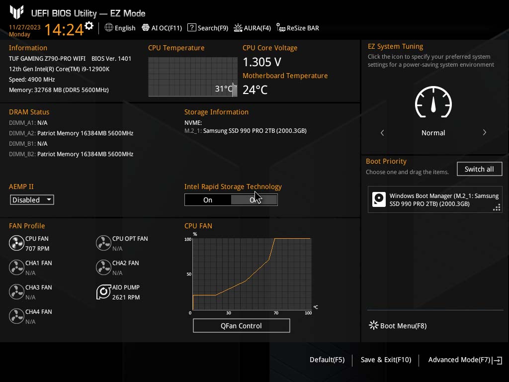 바이오스 첫 화면이며, 설치한 CPU, RAM, SSD 부품들과 시스템 상태를 한눈에 알아 볼수 있으며, F7을 눌러서 Advanced Mode로 변경합니다.