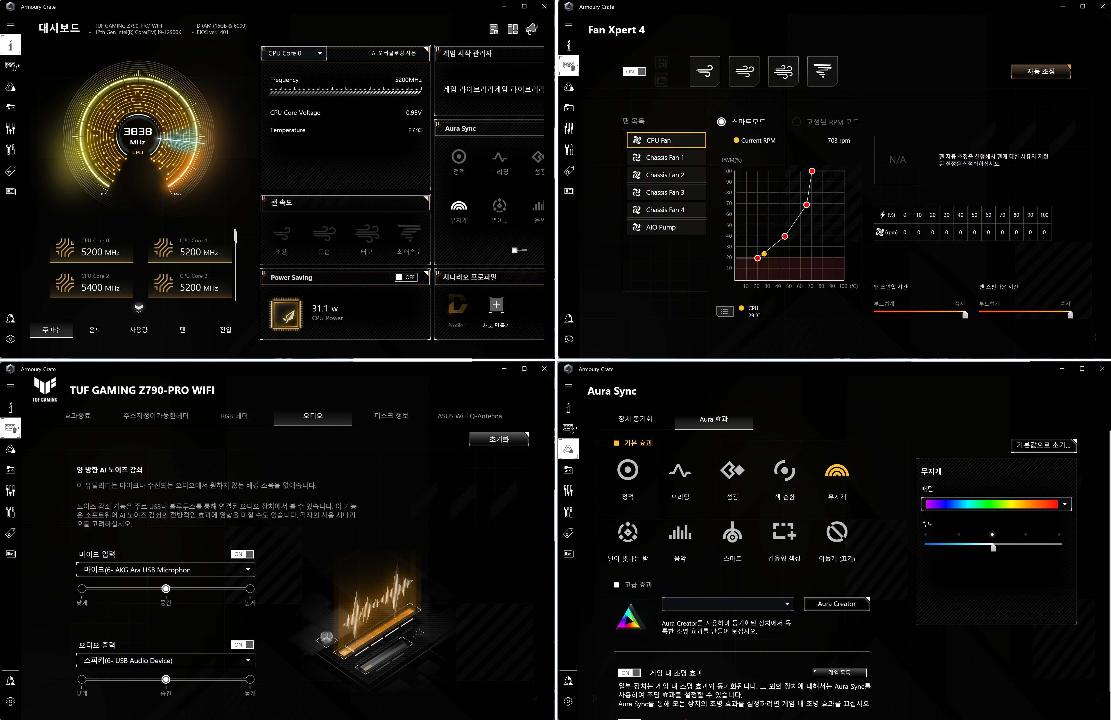 AI 오버클러킹 생소한데, CPU와 냉각을 프로파일링하여 최적의 구성을 예측하고 시스템을 한계까지 올려주는 기술입니다. 간편한 설정에 비해 훌륭한 성능을 누릴 수 있습니다.