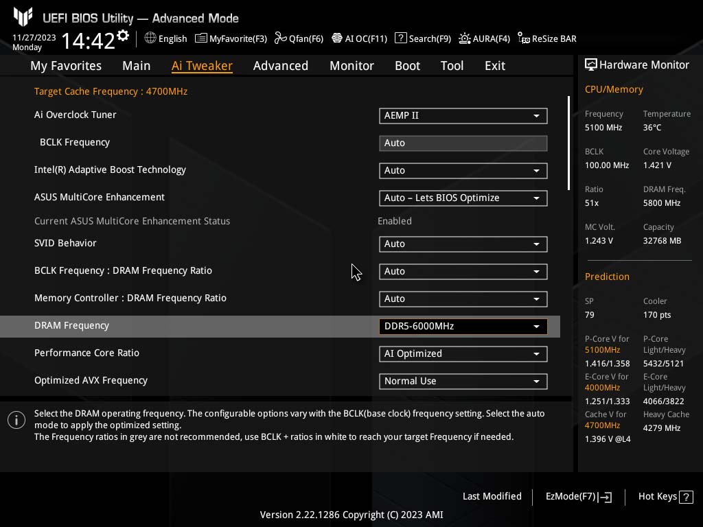 DRAM Frequency가 자동으로 DDR5-6800MHz가 설정되는데, 안정성을 위해서 DDR5-6000MHz로 낮춰서 테스트를 진행했습니다.