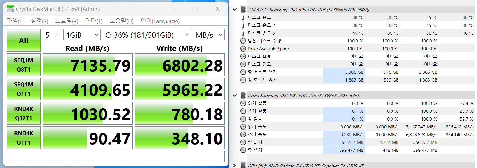 삼성 SSD 990 PRO 2TB 제품을 대상으로 크리스탈디스크마크로 실행한 결과입니다.