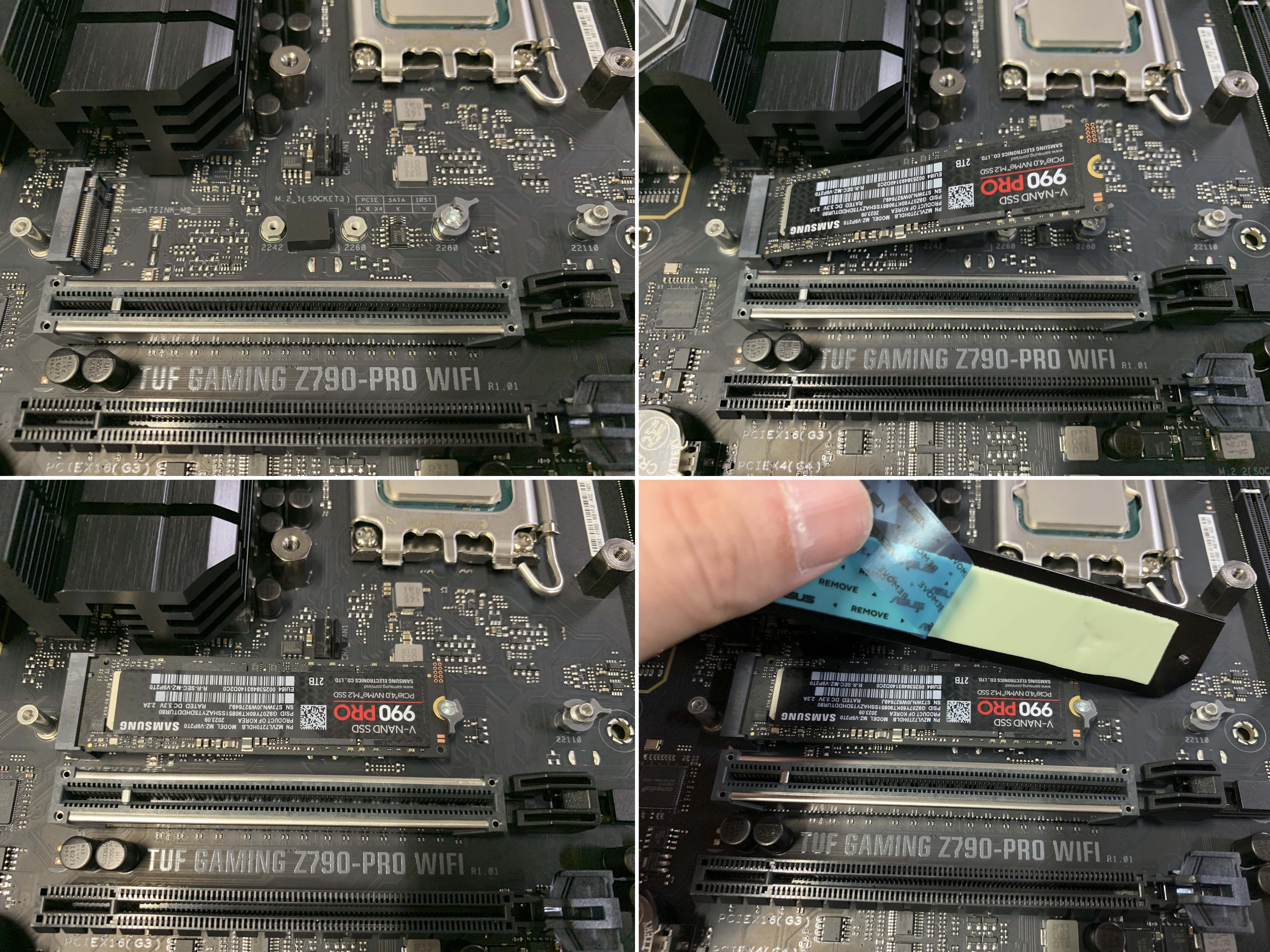 PCIe4.0 M.2 NVMe SSD 슬롯 4개 있습니다. 운영체제를 설치할 1개의 슬롯, 방열판이 없는 1개의 슬롯, 나머지 2개의 슬롯이 분리된 모습입니다. 모든 슬롯에는 M.2 Q-Latch 기능이 제공되어, 나사 없이 M.2 SSD를 장착하고 해제할 수 있습니다. M.2 SSD 나사는 작아서 분실 위험이 있는데, 걸쇠로 고정하는 방식이라 안심되며, 나사가 없어 손쉽게 장착 및 탈착이 가능하도록 설계되었습니다.