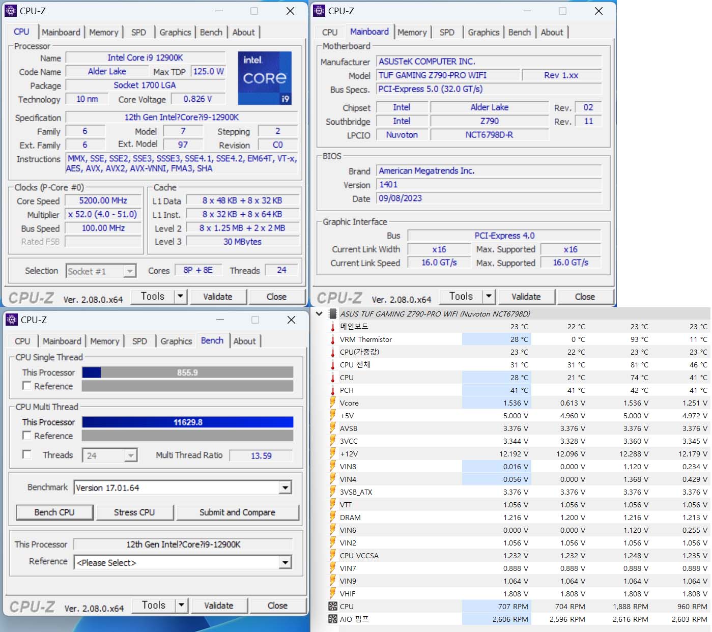 CPU-Z에서 바이오스에서 설정한 값이 동일함을 알 수 있으며, 벤치테스트 결과 싱글 855.9점, 멀티 11629.8 점이 측정되었습니다.