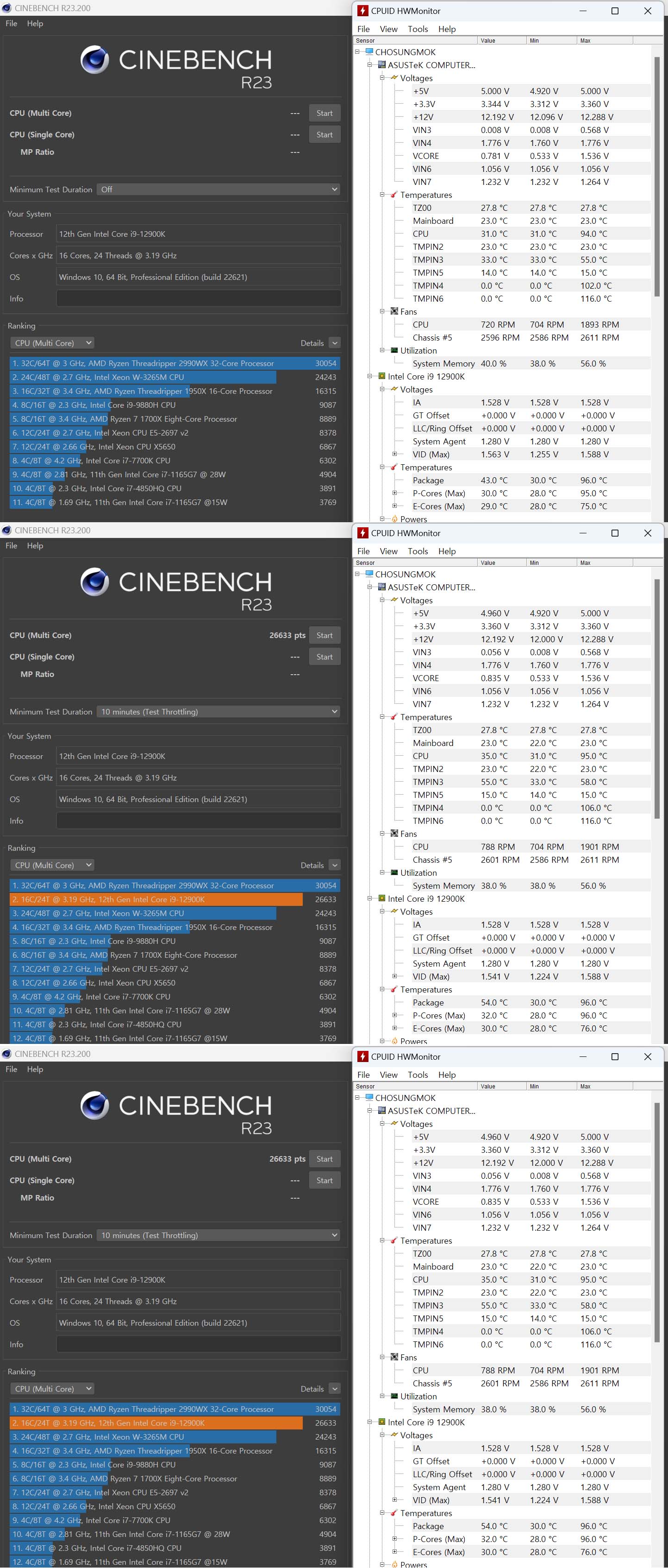 CPU 대기상태 / CINEBENCH R23 1회 / CINEBENCH R23 10분간 실행했을때, 안정적인 전원공급과 온도로 측정되었으며 점수 또한 미세하지만 평균보다 조금 더 좋은 결과가 나왔습니다.