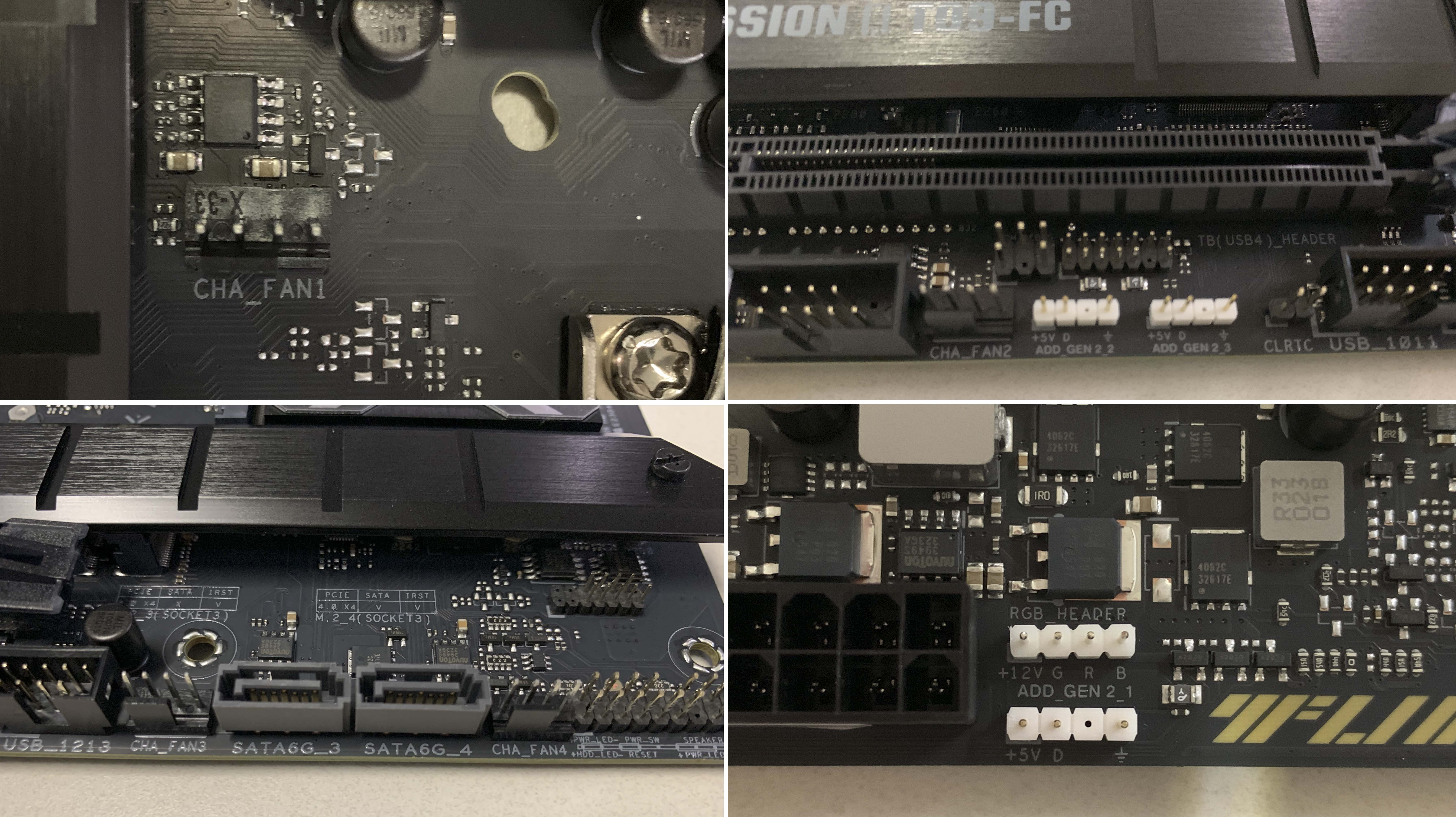 FAN 4개, RGB 헤더 1개, Addressable Gen 2 RGB 헤더 2개가 메인보드 측면, 하단에 골고루 배치되어 있어서 넉넉한 확장성과 조립이 편리해집니다. Armoury Crate에서 팬속도와 LED를 설정할 수 있습니다.