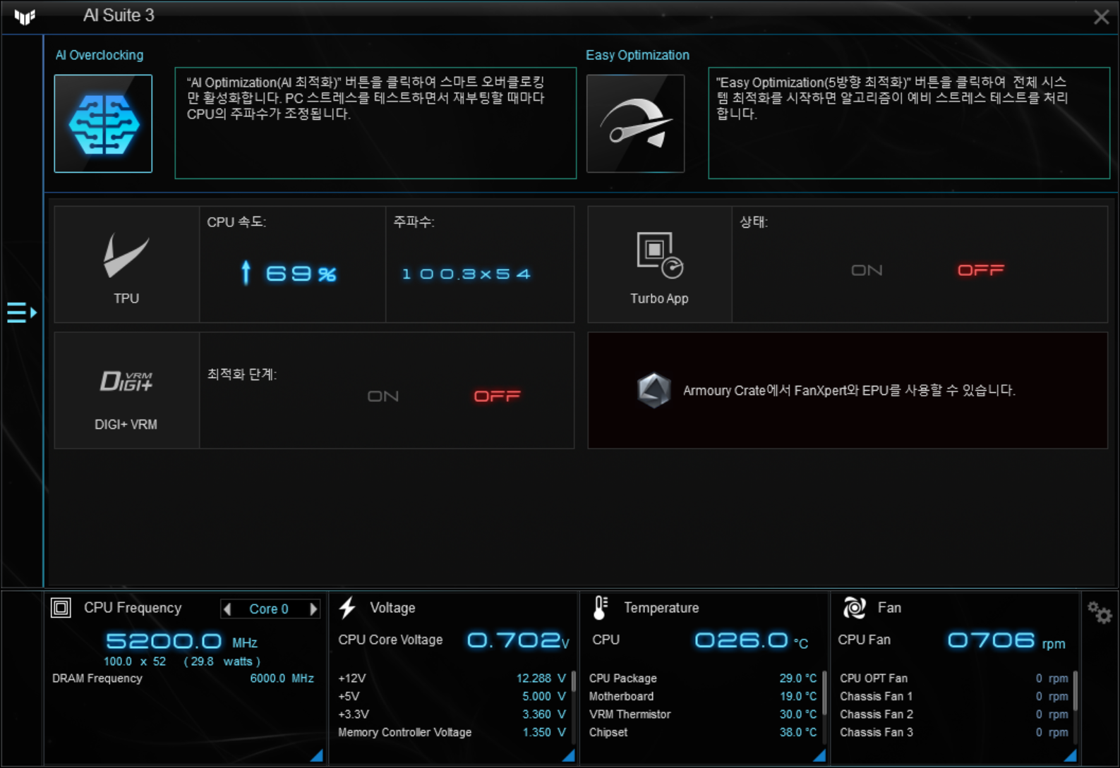 메인보드 교체시, 드라이버를 직접 다운로드 받고 설치하는게 여간 번거로운 일이 아닌데, Armoury Crate로 간편하게 필요한 설치를 가능하게 해줍니다. 윈도우를 실행하면, 화면 우하단에 설치 여부를 알려줍니다.