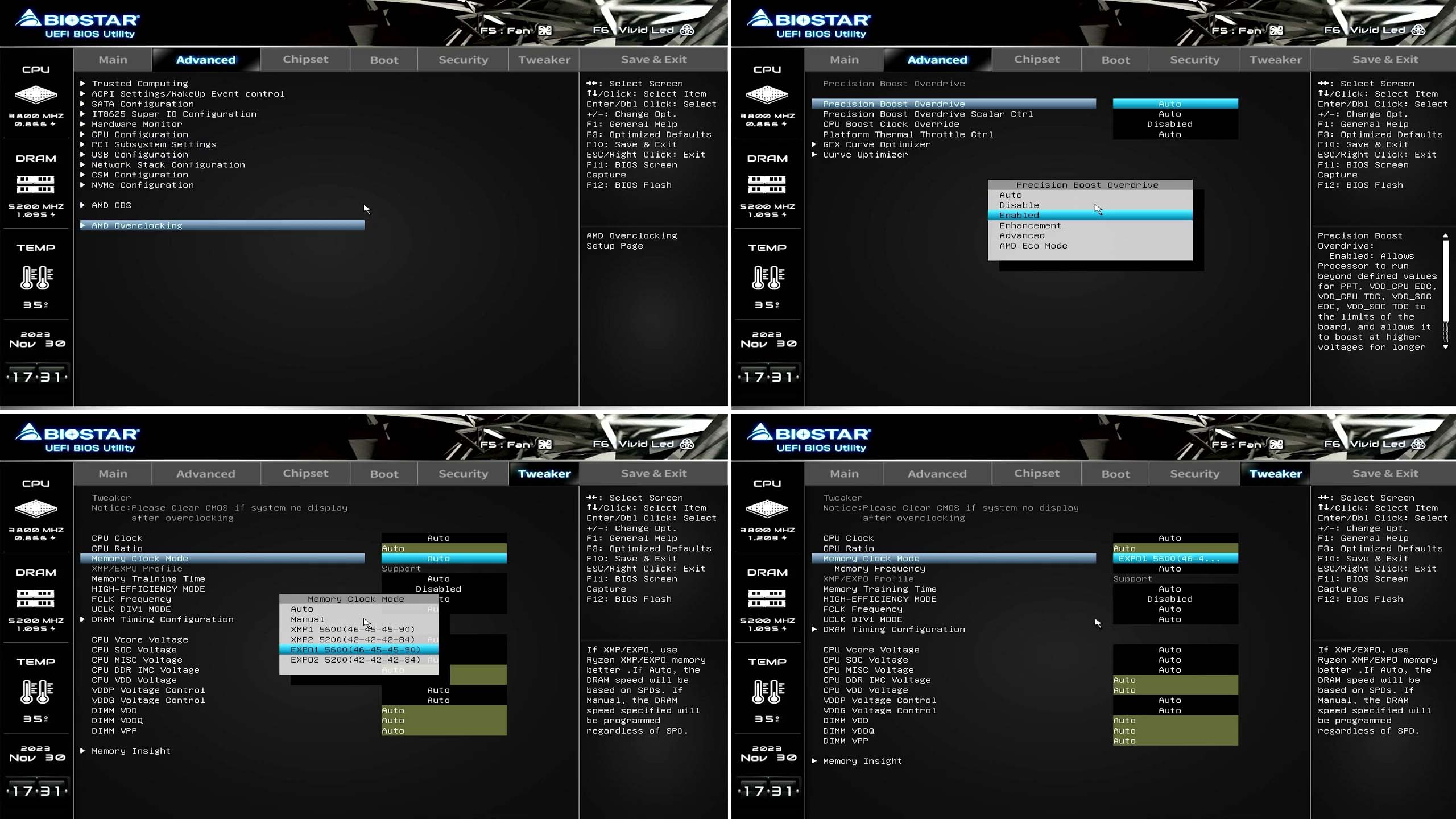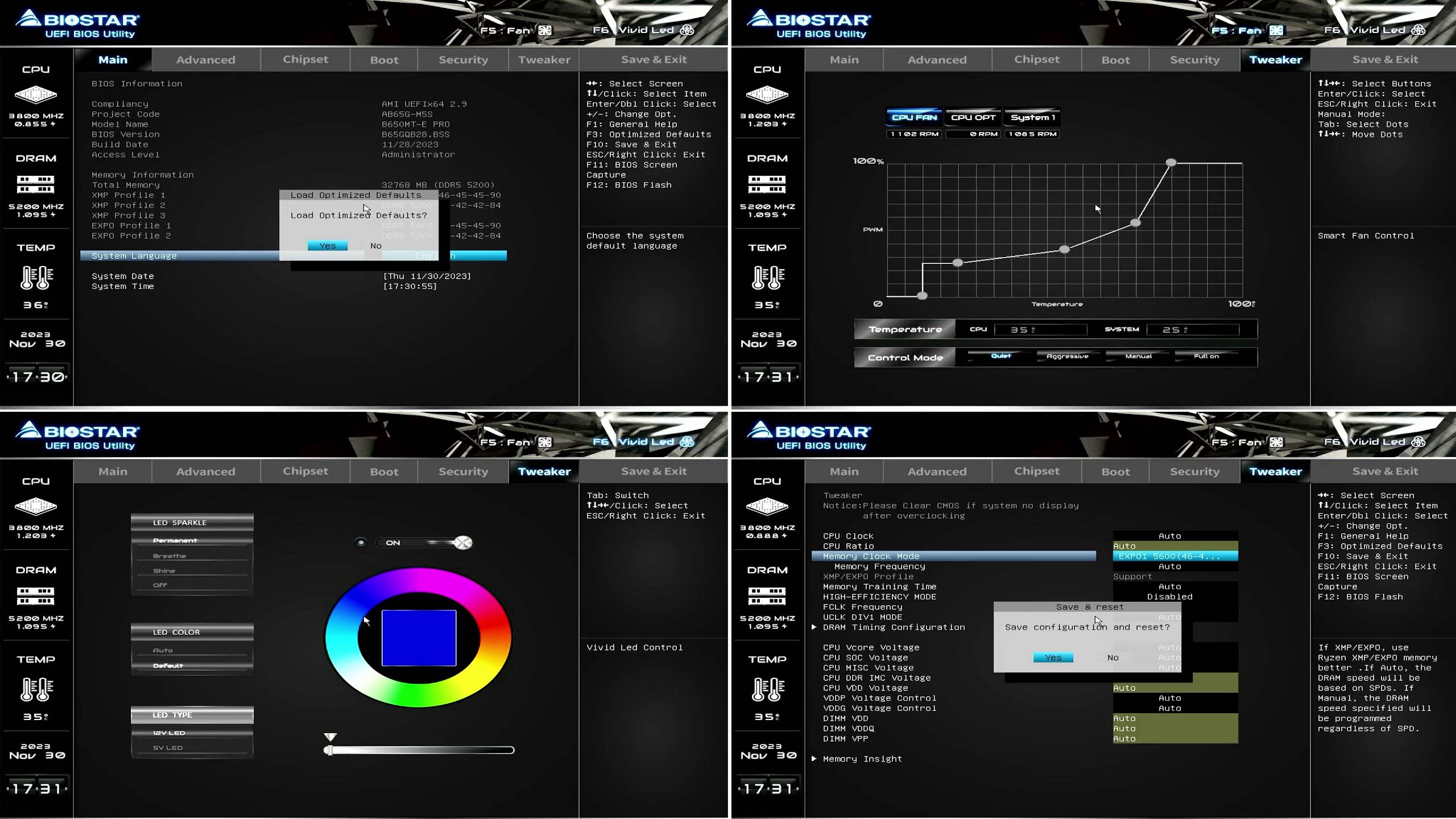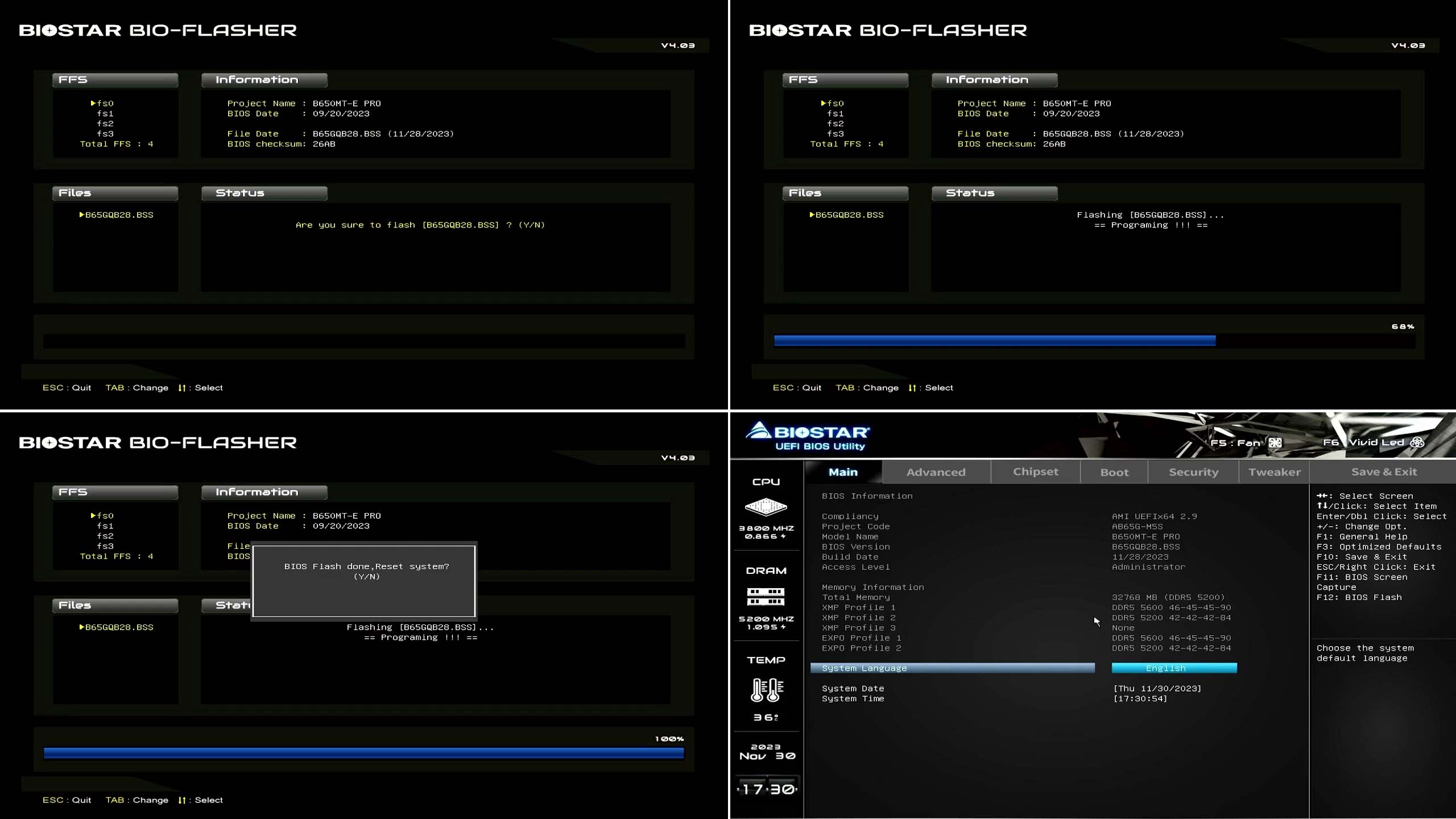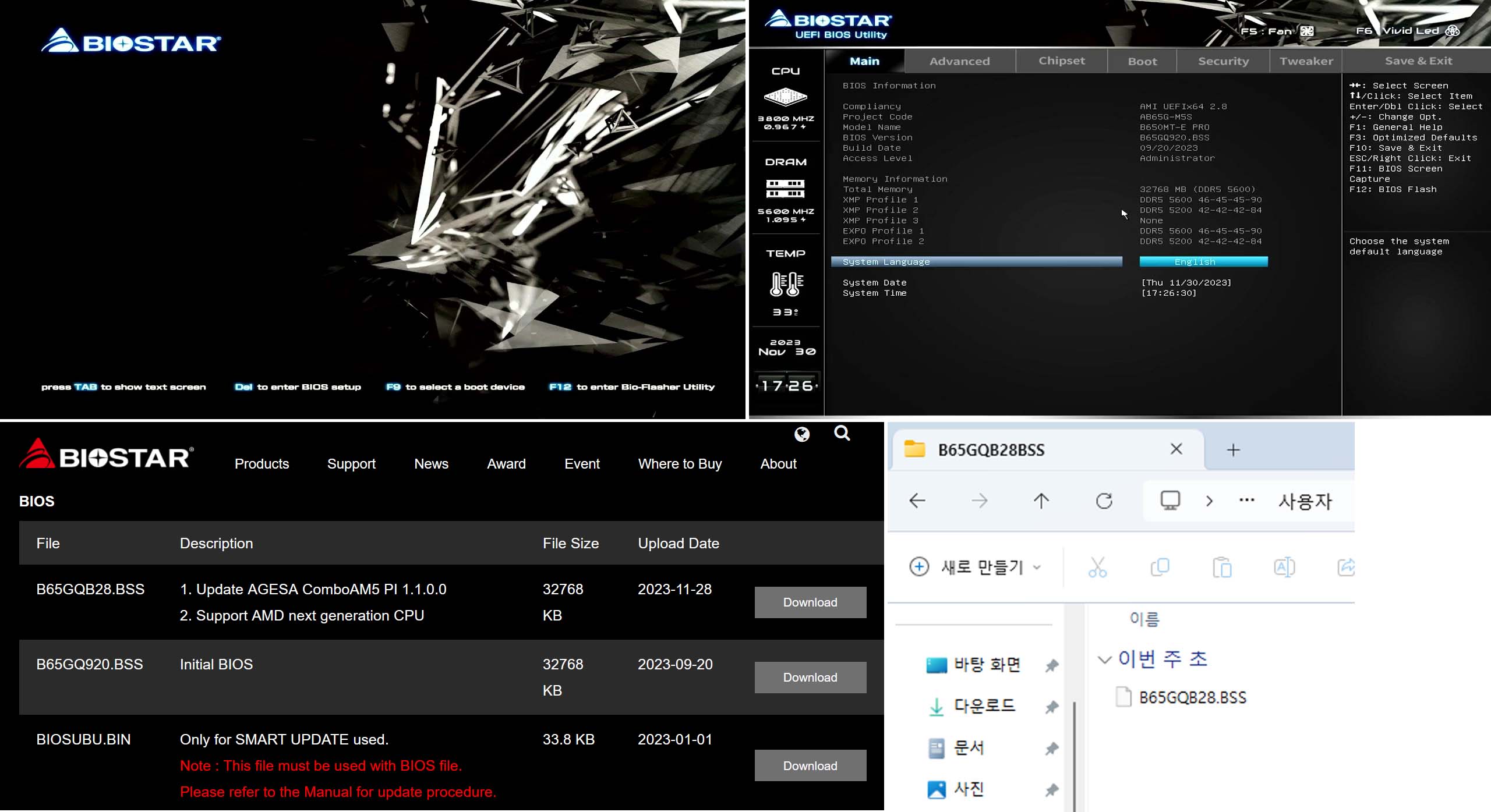 첫 화면에서 2023년 9월 20일 버전이라, BIOSTAR 홈페이지에서 최신 버전(2023년 11월 28일)을 다운받아, 최신 바이오스 업데이트 진행했습니다.