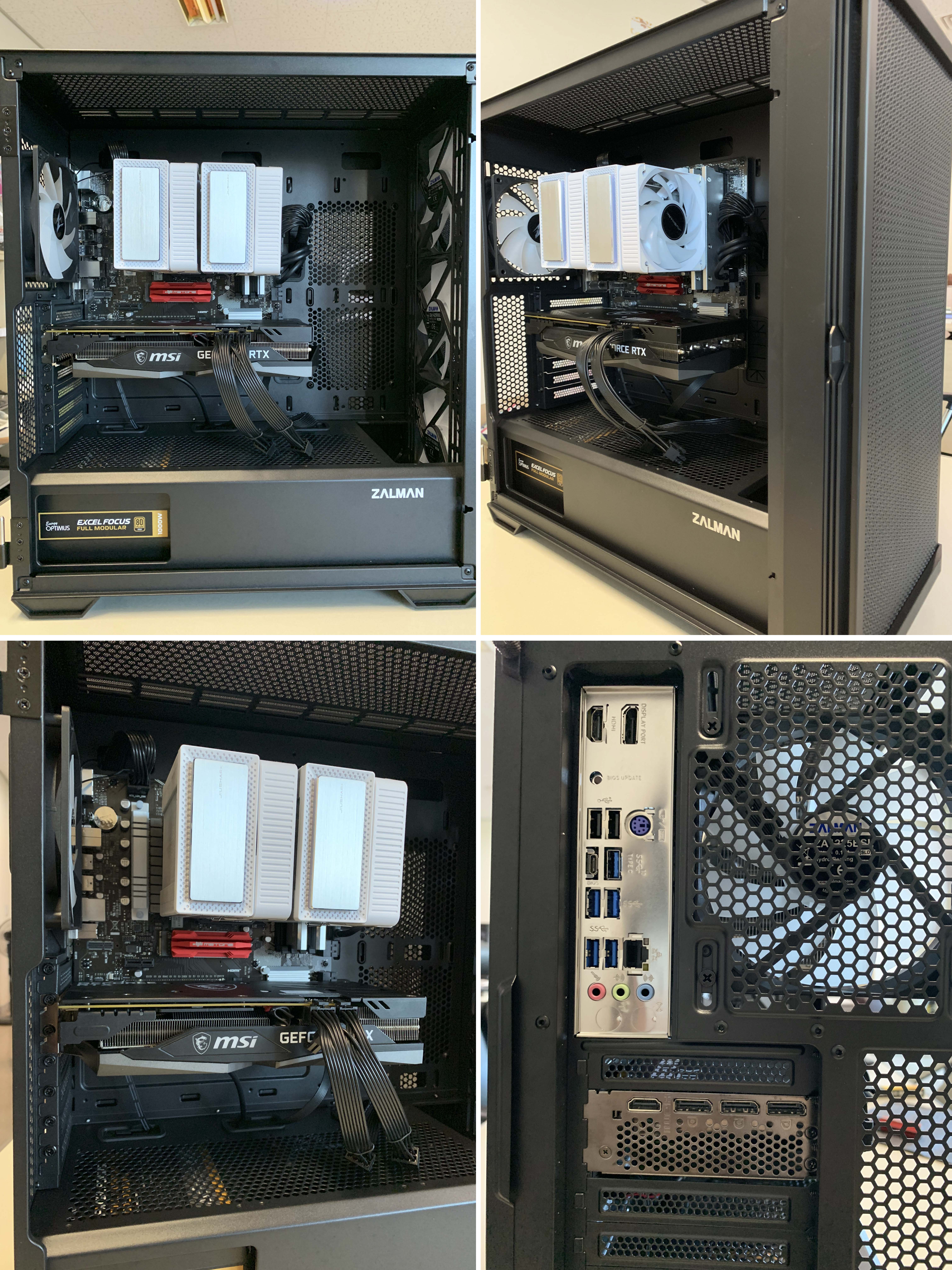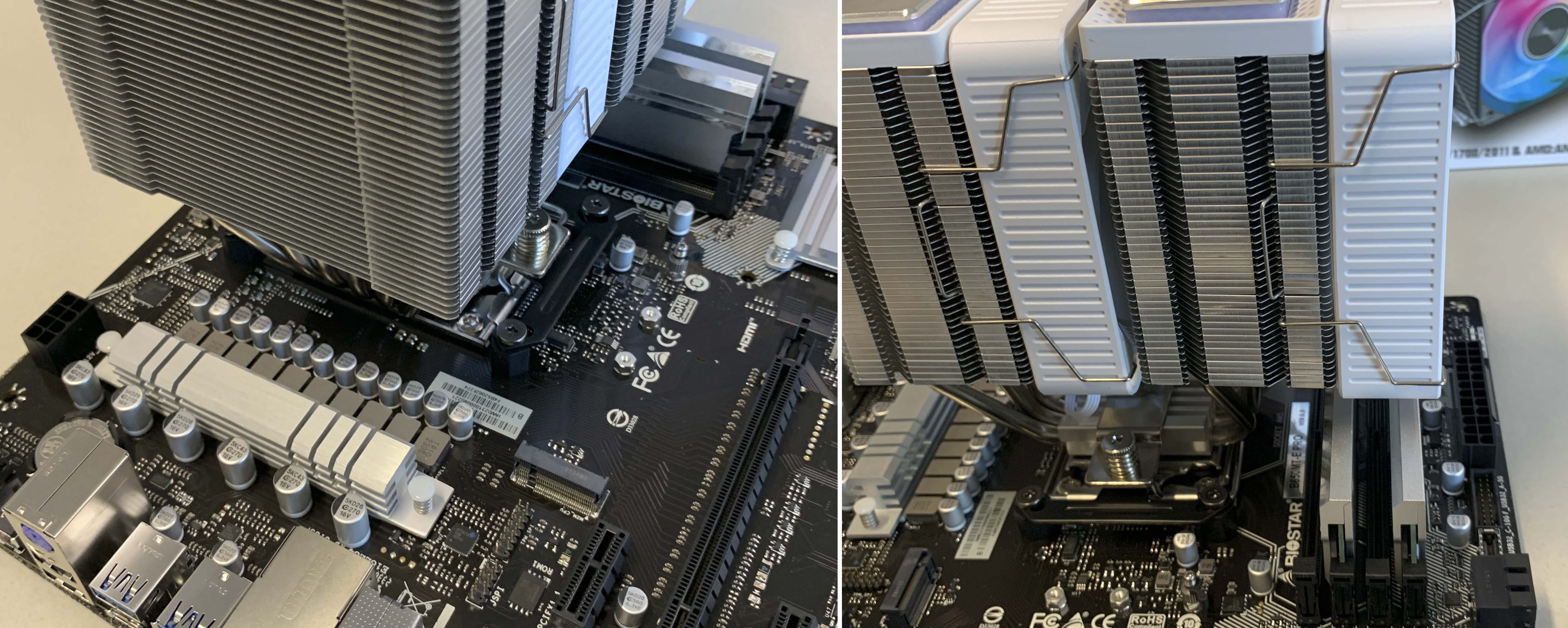 방열판이 있는 장착한 램을 먼저 설치하고, 트윈타워형 CPU 공랭쿨러를 장착합니다.
