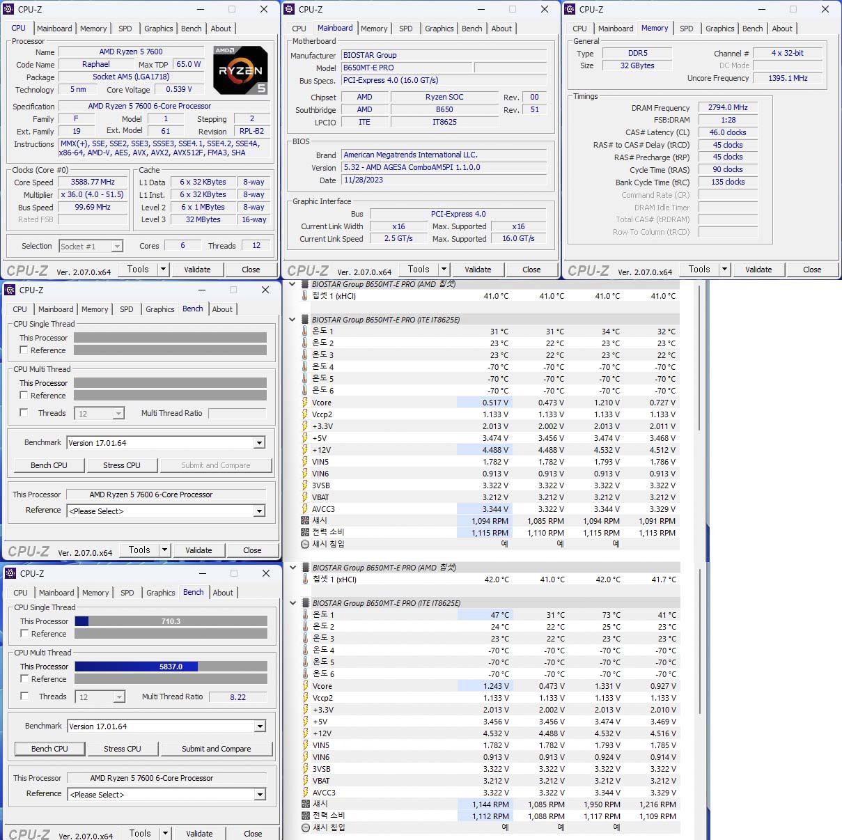 CPU-Z 프로그램에서 CPU 라이젠 7600 및 메인보드 BIOSTAR B650MT-E PRO의 정보와, 바이오스에서 설정한 램 EXPO 또한 정상 작동하는것을 확인했습니다.