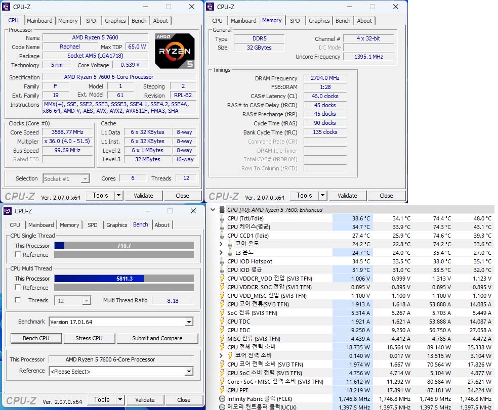 벤치테스트 결과 싱글 710.7점, 멀티 5811.3점의 점수와 최대 온도 74.4도의 결과가 측정되었습니다.