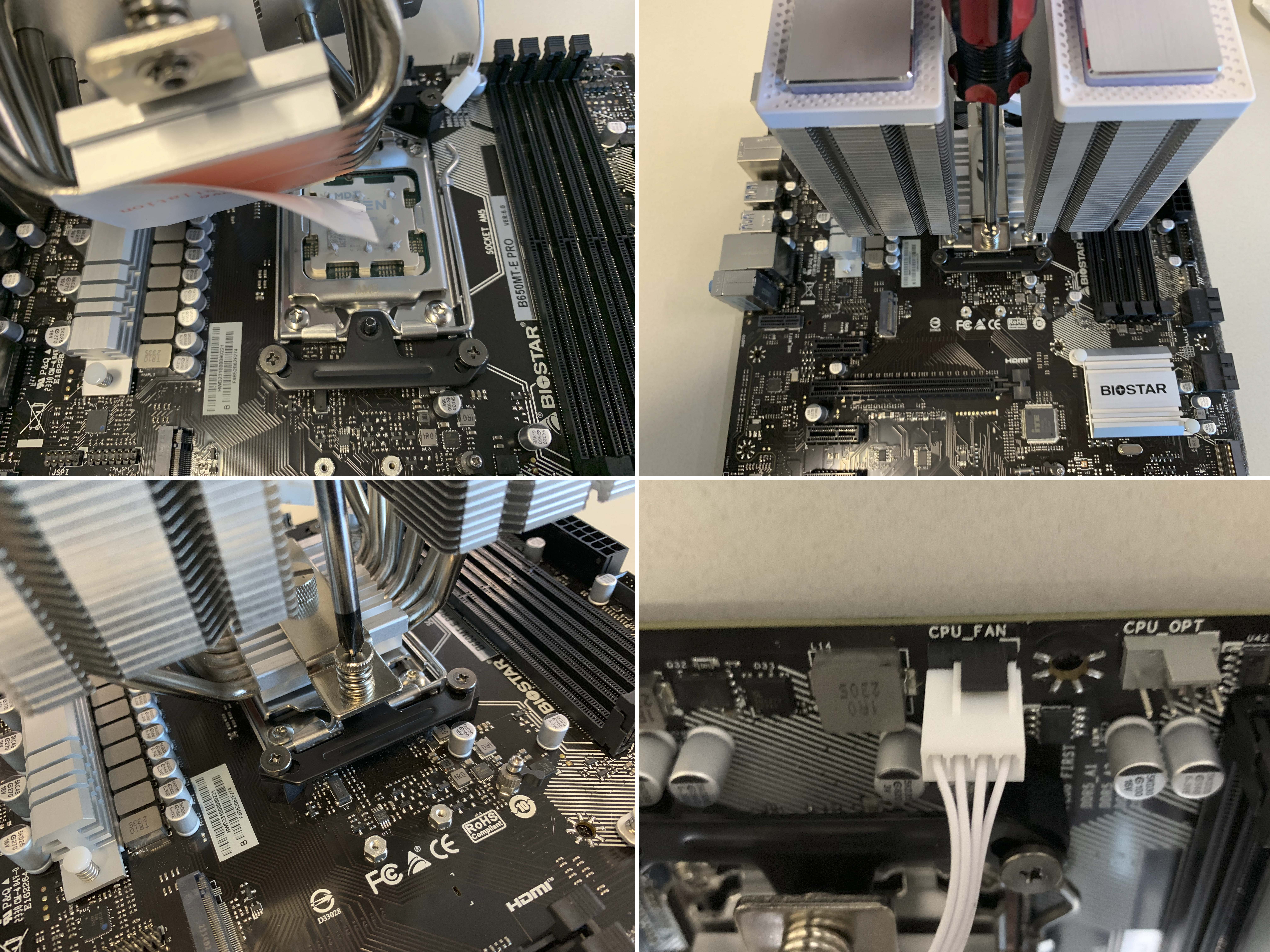 스티커를 제거하고 양쪽에 있는 나사를 2회~3회 번갈아 가면서 조여가며 고정하고, 분리해둔 쿨링 팬을 설치합니다.