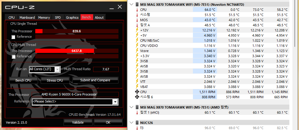 벤치테스트 실행시, 싱글/멀티는 각각 839.6점 / 6437.8점, 최대 온도 73도가 측정되었습니다.